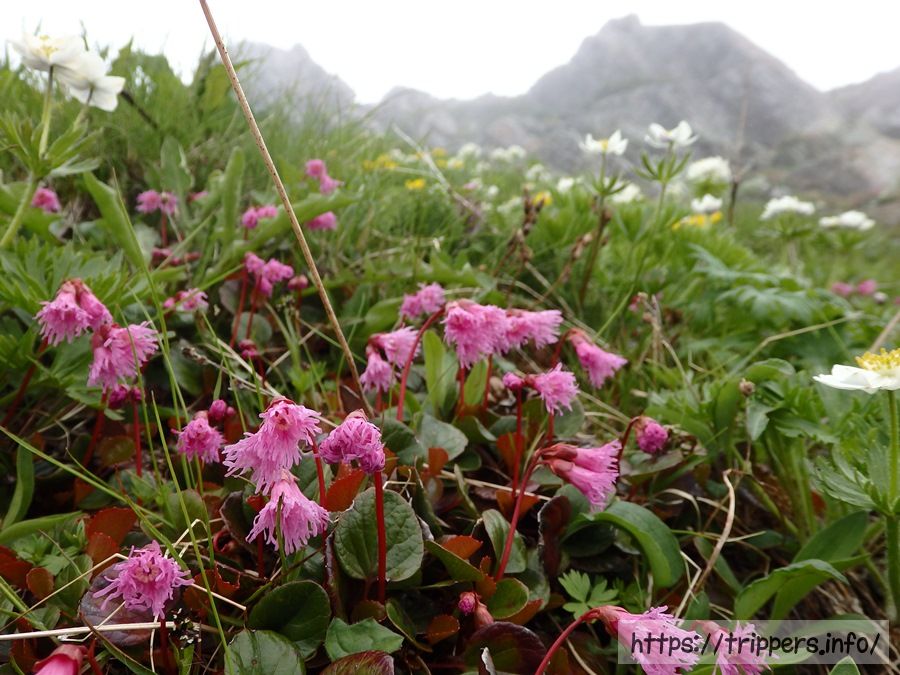 コイワカガミです。イワカガミと違って葉っぱがギザギザしていません。景色は残念なので、せめて花見登山でもしましょう。