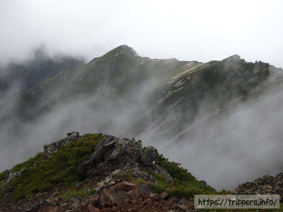 後ろを振り返ると鳳凰三山が見えるルートらしいのですが、もうちょっと標高が高くないと見えないのか、この山が鳳凰三山の一部なのか良く分かってません。結局ガスって、せっかく見えた山の一部も見えなくなりました。