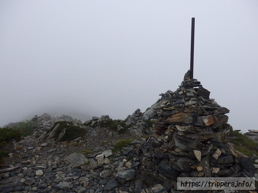 ケルンがありました。今日のようにガスった時に迷子にならないためのピラミッド型につみあげて作った道標です。ただここは1本道の分かりやすい稜線なので、無雪期では活躍しなさそうです。記念碑としての意味合いが強いのでしょうか。