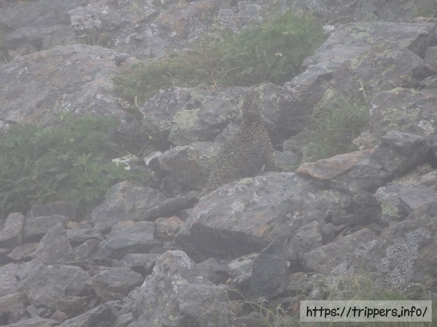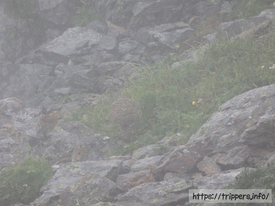 職員がいる場所まで行くと、雨と雷鳥の保護色で分かりにくいですが、確かに雷鳥がいました!ずっと見たかったので感激です。