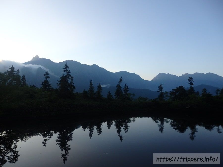 夜がまだ明け始める前に起き出し、鏡平山荘から鏡池へ来てみました。槍ヶ岳の穂先近くにある槍ヶ岳山荘の明かりが肉眼で見えます。小屋の人は起床し、朝食の準備でもしているのかもしれないですね。そして水面にも映っていました。