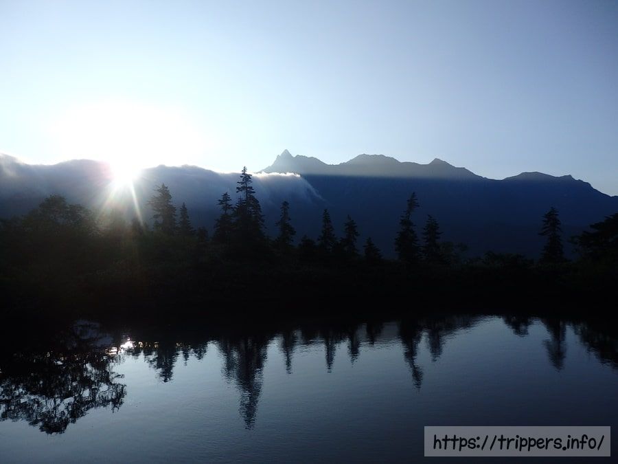 ここは標高2,300mと周囲より低い場所にあるため、もっと前に雲や地平線から顔を出していたけれど、西鎌尾根に隠れていた日の出済みの赤くない太陽しか見れないのかもしれないです。水晶小屋では太陽は尾根や山に遮られる事なく、赤い日の出でした。