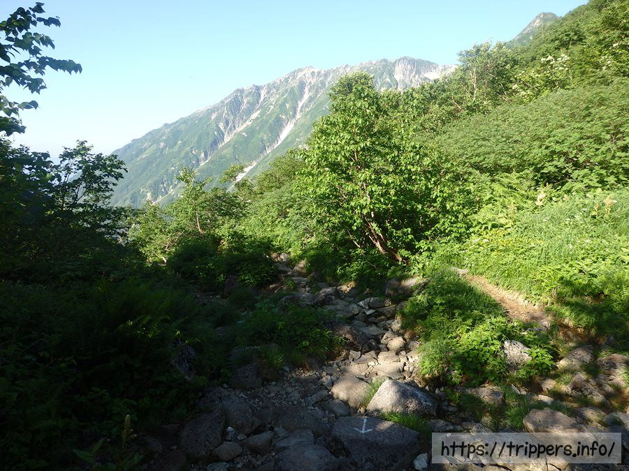 標高1,720mの秩父沢出合まで下ってきました。ここに来るまでにすれ違ったこれから山を目指す登り登山客は、ひたすら続く登りで汗と疲労が凄い事になっていました。初日はこんな感じだったのかと振り返ります。汗も疲労もないので、ここで休憩せずにどんどん下山していきます。