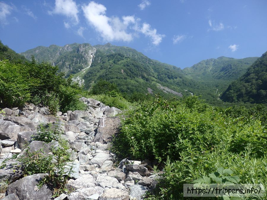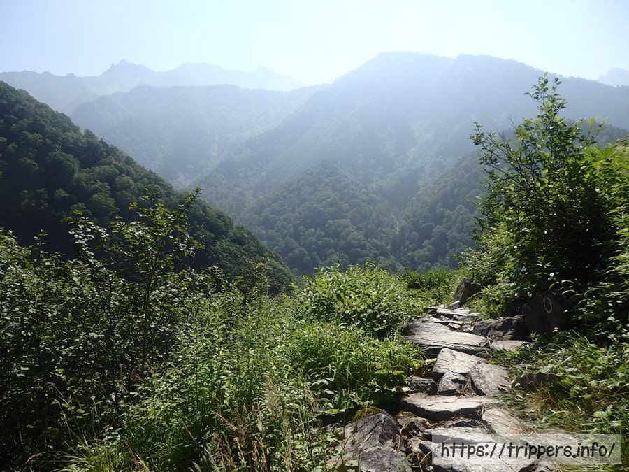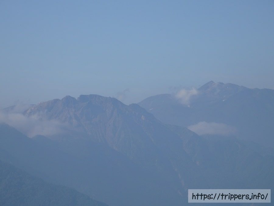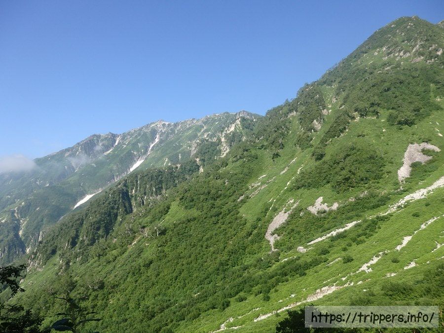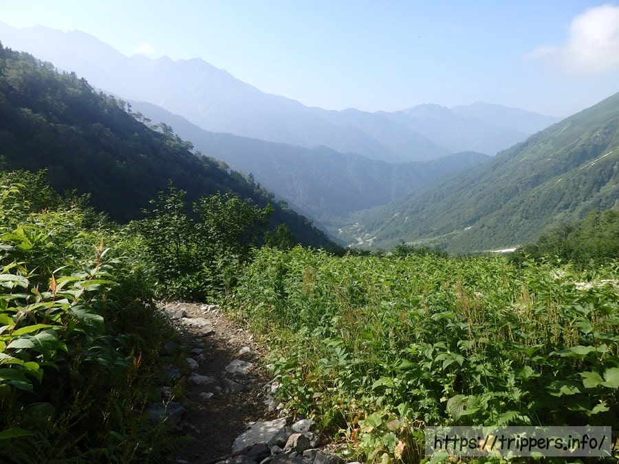 今日通過する小池新道登山口は、ここから見える谷の底のような部分にあります。結構遠くですが、今まで歩いてきた距離を考えると近いですね。それに今日は登りがないため、あっと言う間に目的地に到着予定です。