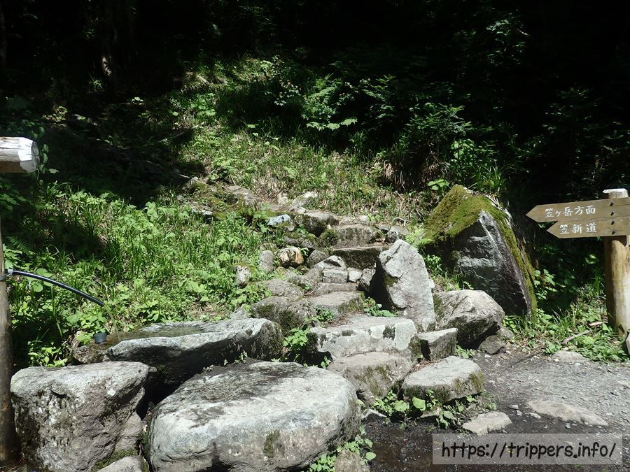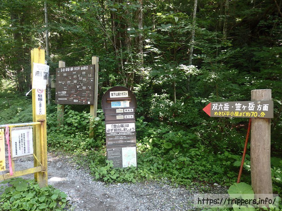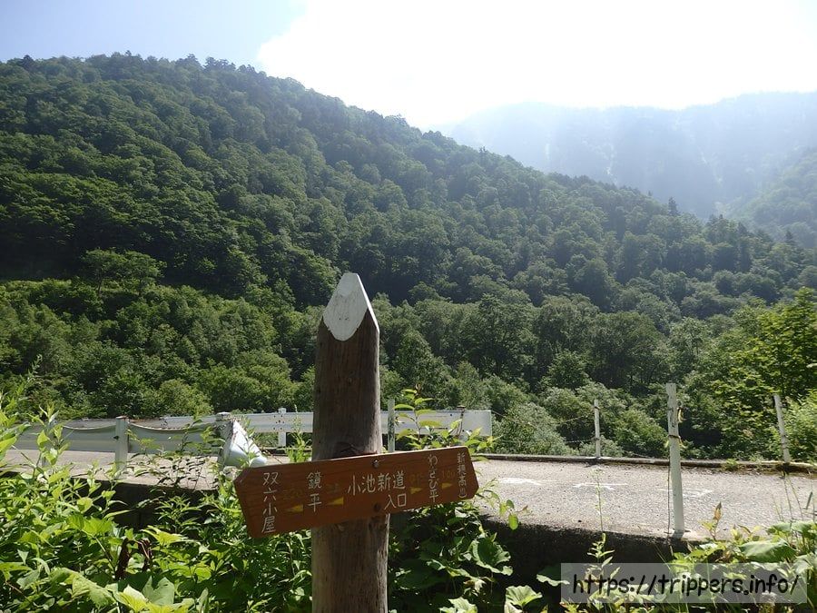 小池新道登山口に到着。ガードレールがある道は登山者がとっても少ないルートで、奥丸山と槍平小屋があります。南岳や槍ヶ岳へ通じる槍平小屋へは新穂高温泉から別の道でより楽に行けるので、このガードレールがある道を歩く登山者はほぼいない気がします。この道をあえて使う理由は奥丸山に登る以外、思いつきません。