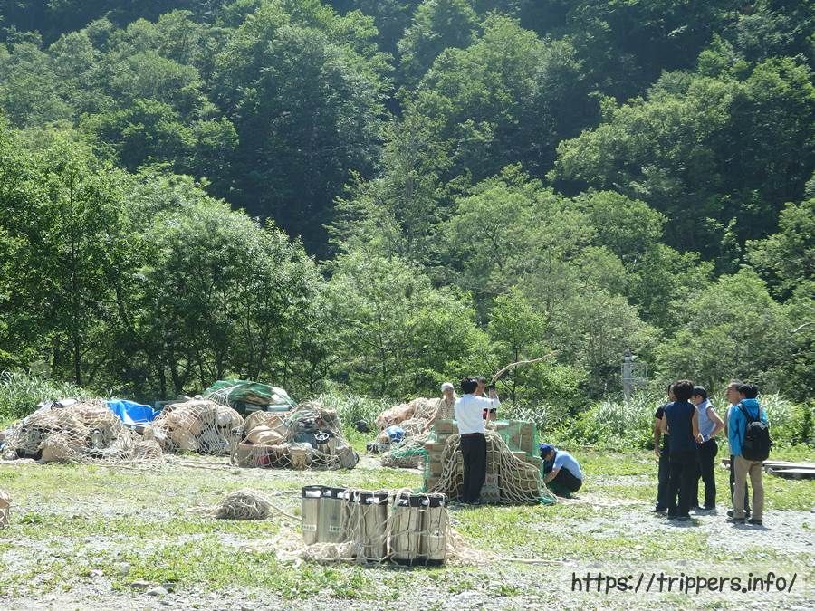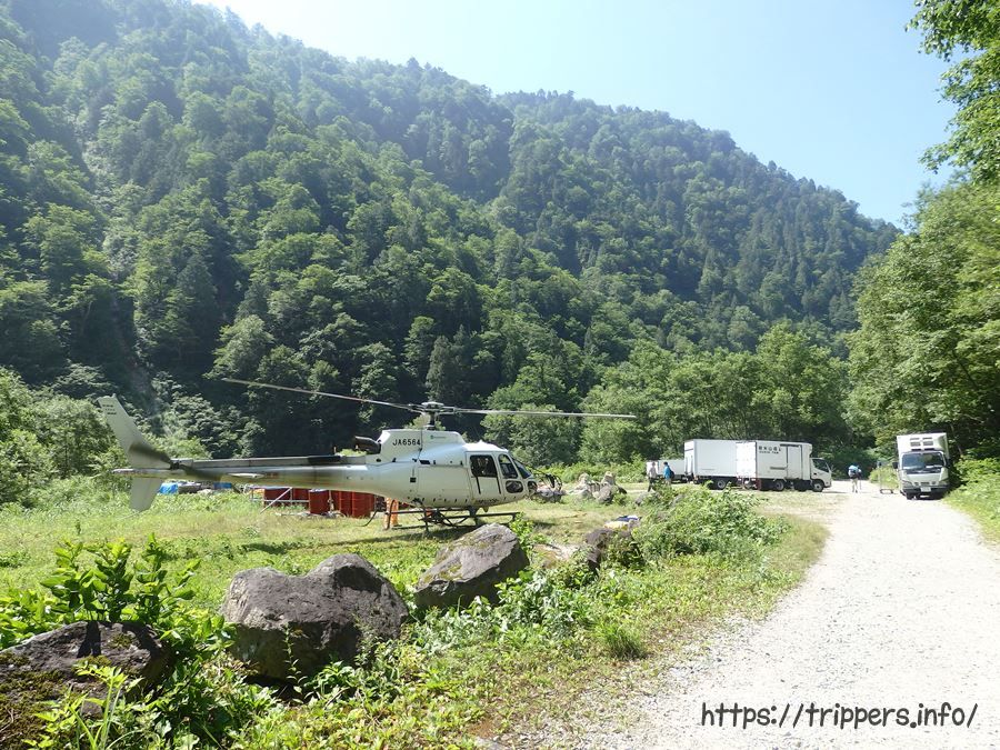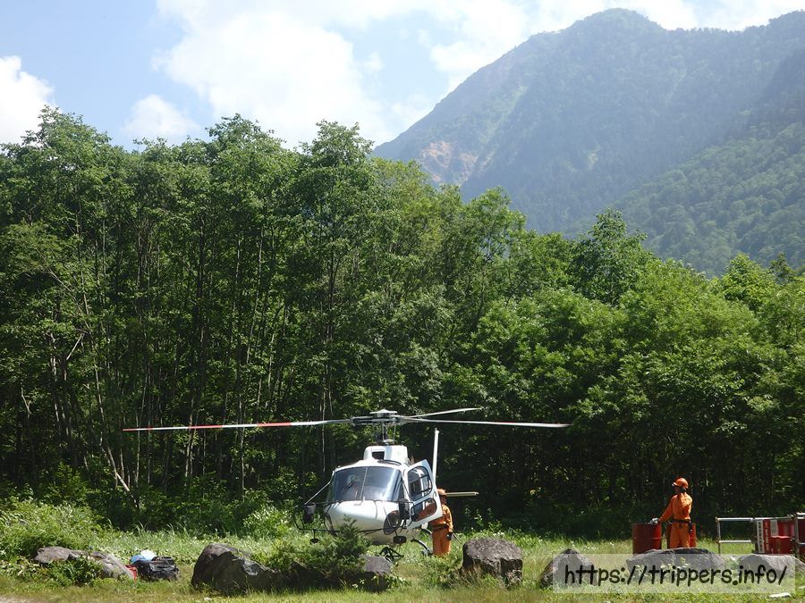 山小屋へ届けるために荷揚げ作業をしていました。ヘリコプターってどこから飛んでくるのか不明だったのですが、荷物を載せたトラックが通れる新穂高温泉の方から飛んでいたんですね。