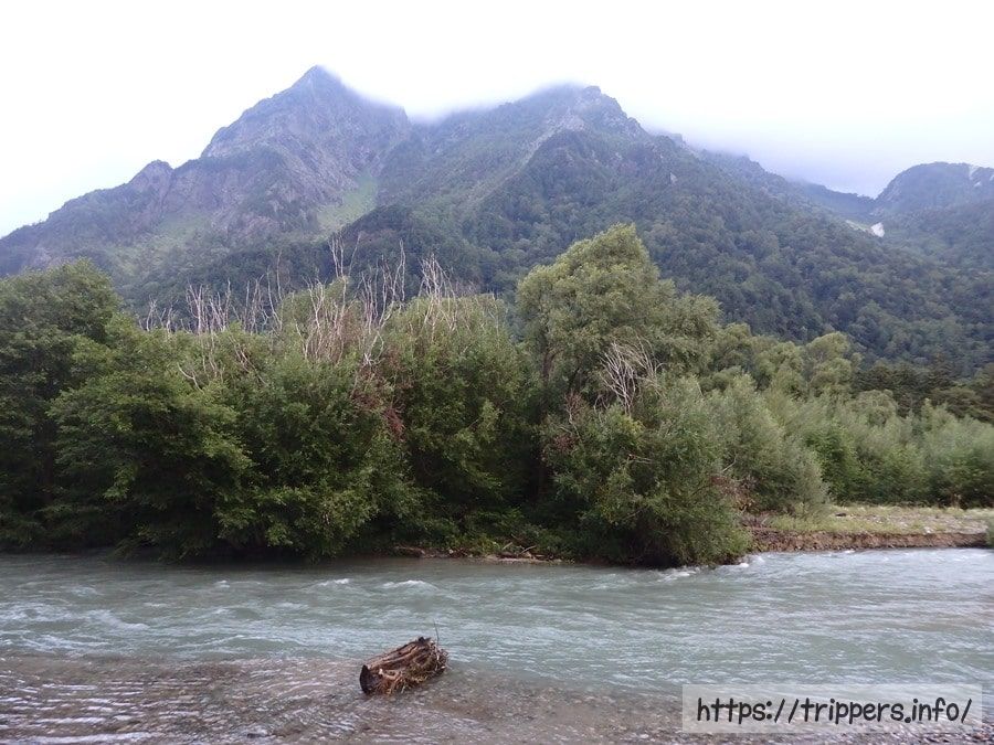 上高地に到着すると、天気はなんとか持ちこたえているようです。雲は多いけれど、雨は降りそうにない予感ですが、水量が普段よりも多いのが気になります。