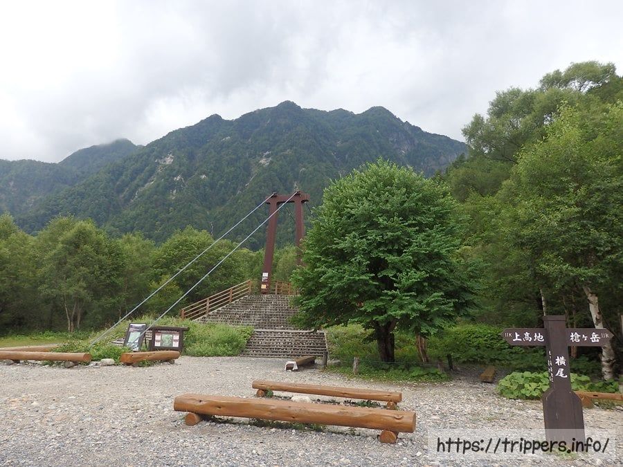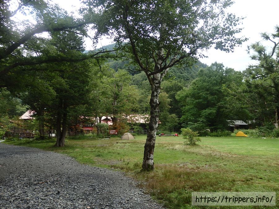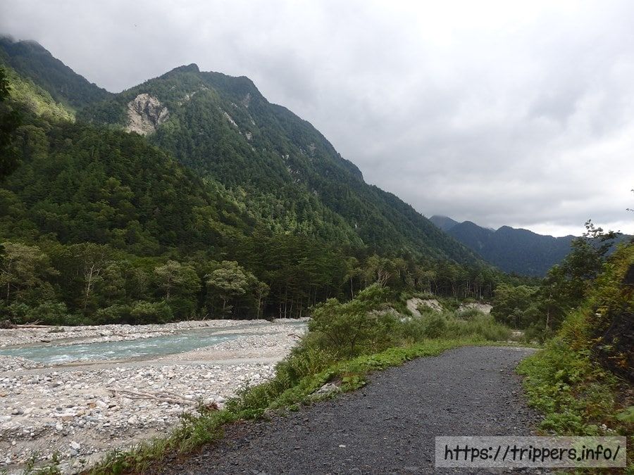 上高地から横尾までは平坦な道です。上高地にある小梨平は普段はテントが多いイメージですが、ガラガラでした。