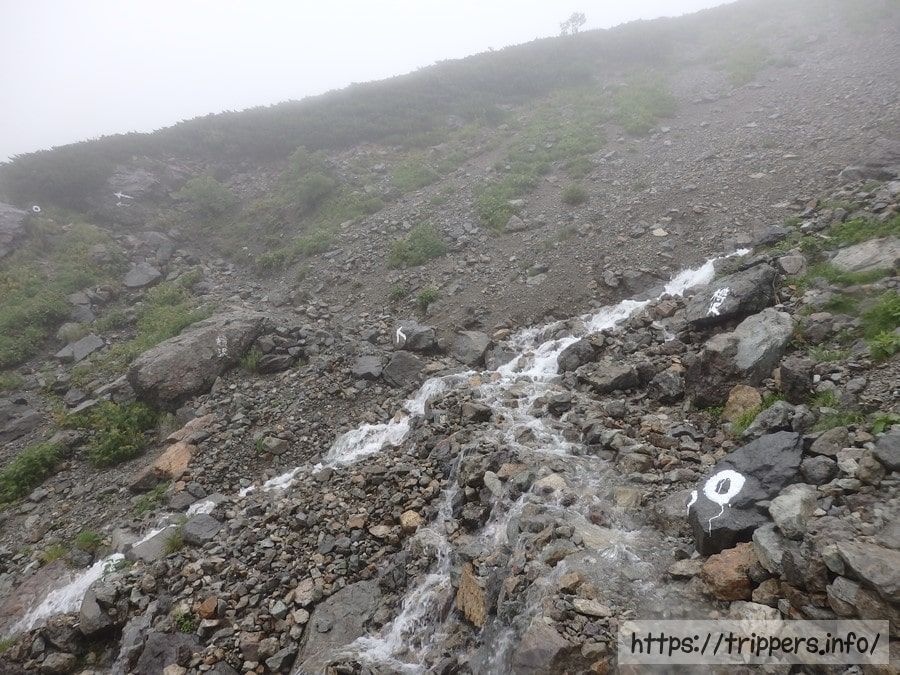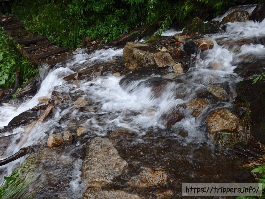 水が登山道にあふれ出していますが、中までびしょ濡れの登山靴なので気にせず歩いて行きます。