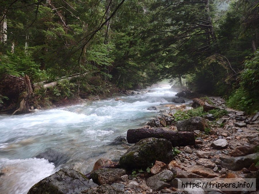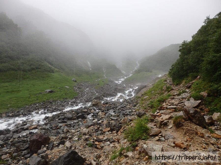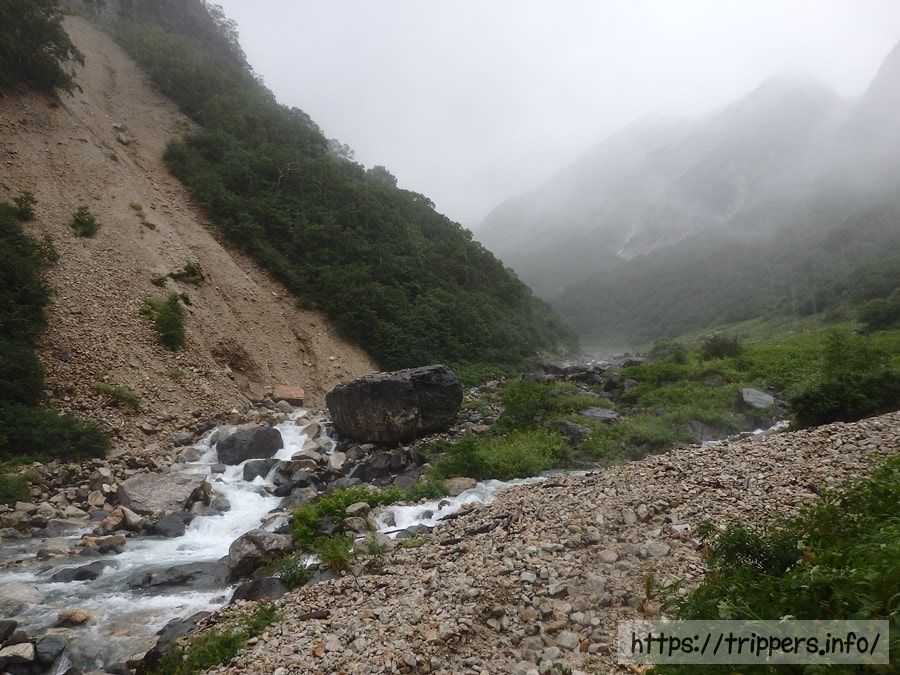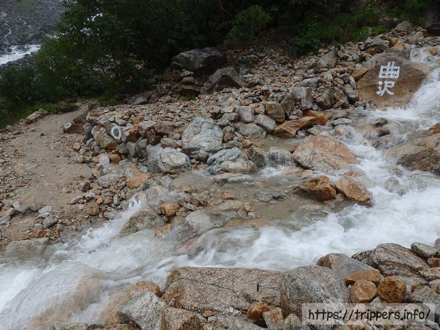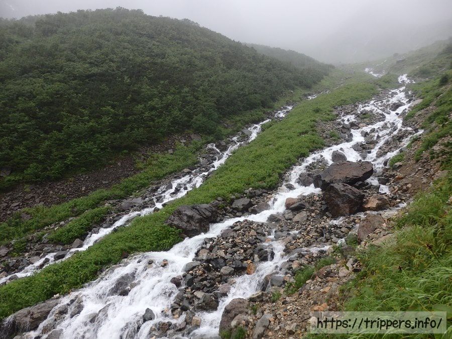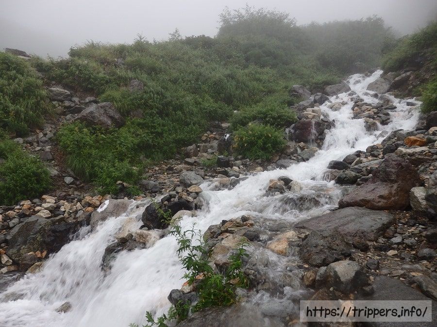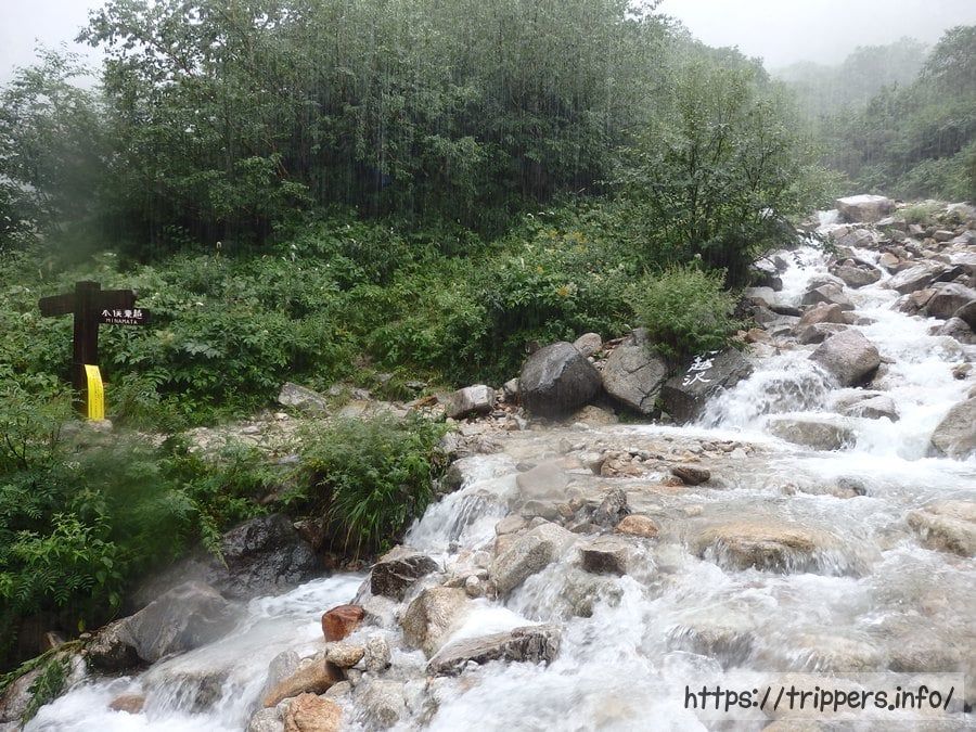 こちらは川が二手に分かれてますが、左側の川は本来川ではありません。登山道が川になっています。靴が浸水しそうな水位があって、マジさげぽよ~(意気消沈)