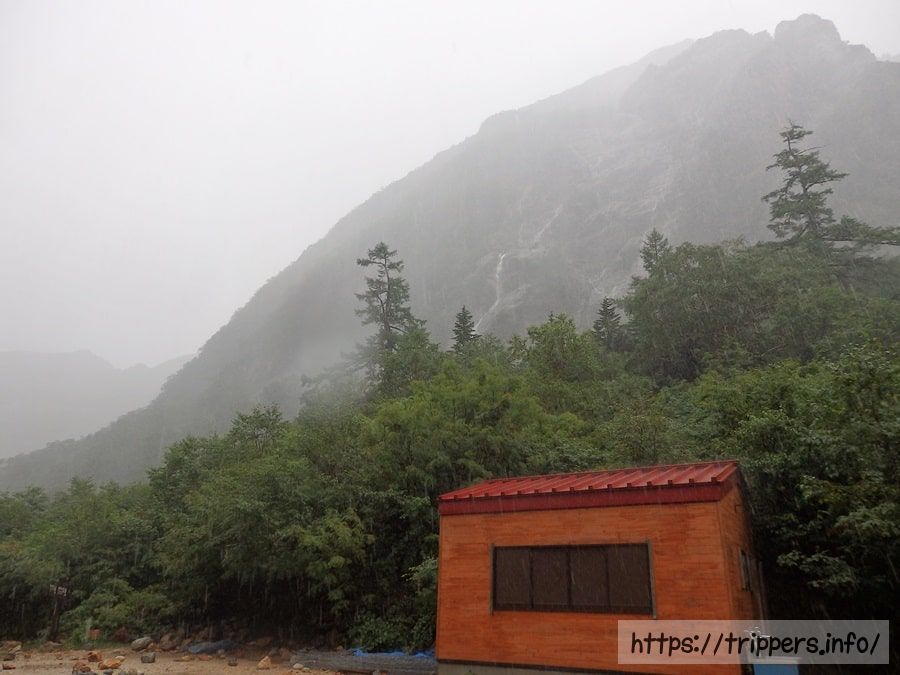テント場であるババ平に到着しましたが、誰もいません。レインウェアと傘のダブルで防雨対策していますが、強い雨風で取り出したカメラが傘の下にあっても濡れてしまいます。レンズを拭いても拭いても濡れるので、写真が雨でボケてしまう結果になります。