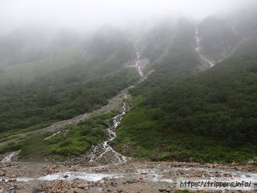 実はこの日、上高地からパノラマコースを経由して涸沢カールへ向かった登山者が奥又白谷の沢で流されて亡くなっています。地上が小雨なら山は大雨って言いますし、雨の日の沢ルートはやはり怖いです。槍ヶ岳へのルートも注意して行きます。