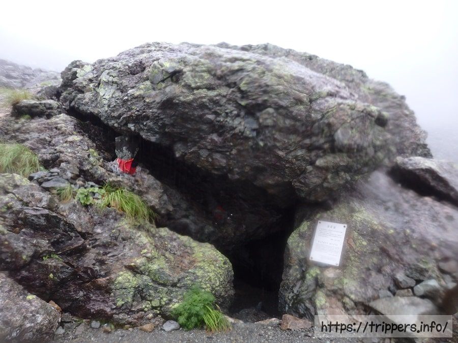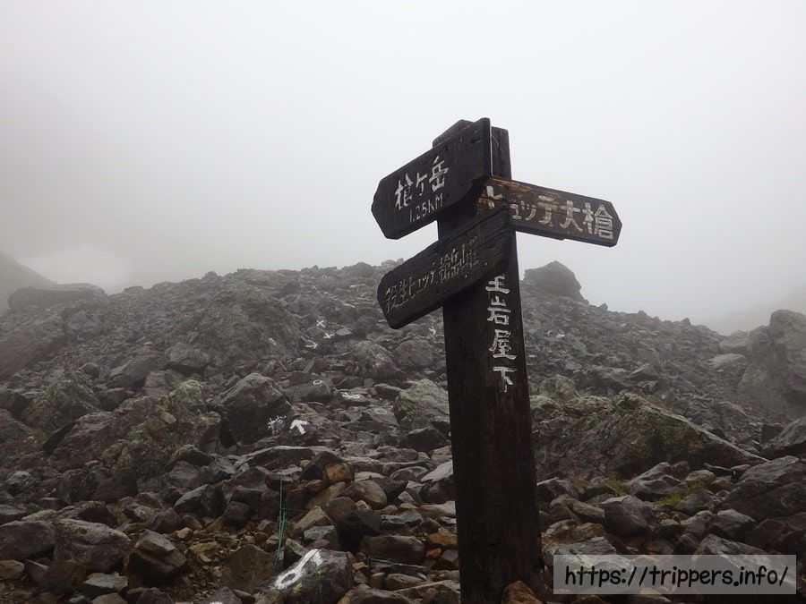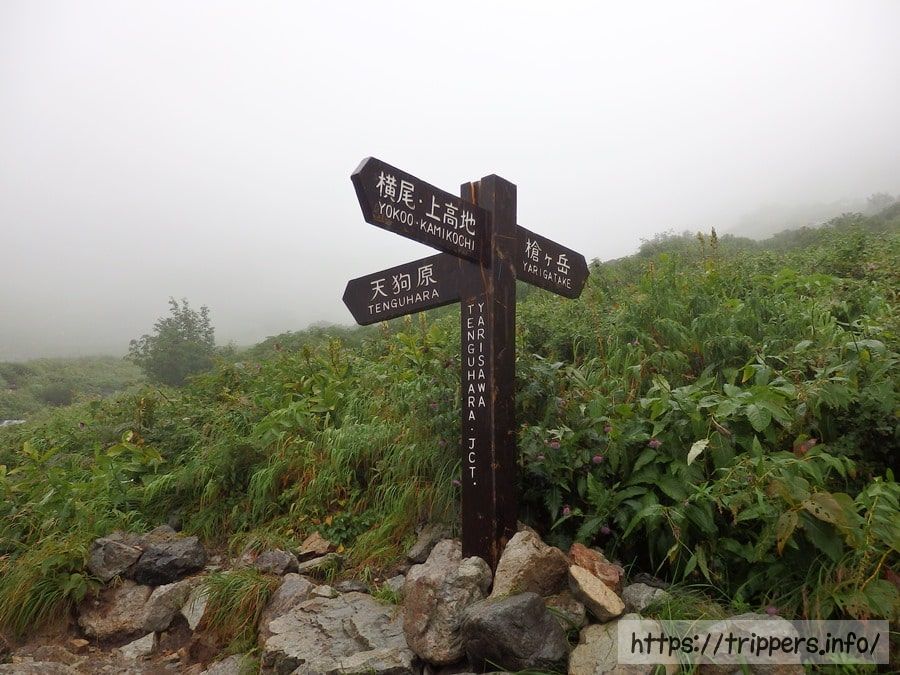 坊主岩屋下の分岐点まで来ました。本来はようやく槍ヶ岳の穂先が見えてくる場所でしたが、生憎の天気です。