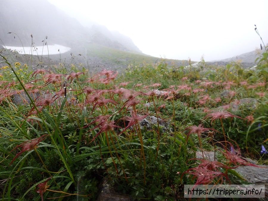 雨に濡れているためチングルマの穂が鮮やかなピンクになっています。去年槍ヶ岳に登った時は、ここでチングルマの穂と穂先のツーショット写真を撮りました。