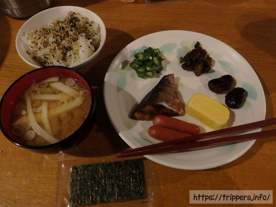 朝食は宿泊者65人で全員1回目に食べられるので事前に並ぶ人はいません。ガスって意気消沈、食欲もあまりないまま5時に食べ始めました。去年来た時はソーセージではなくハムでした。微々たる違いはありました。