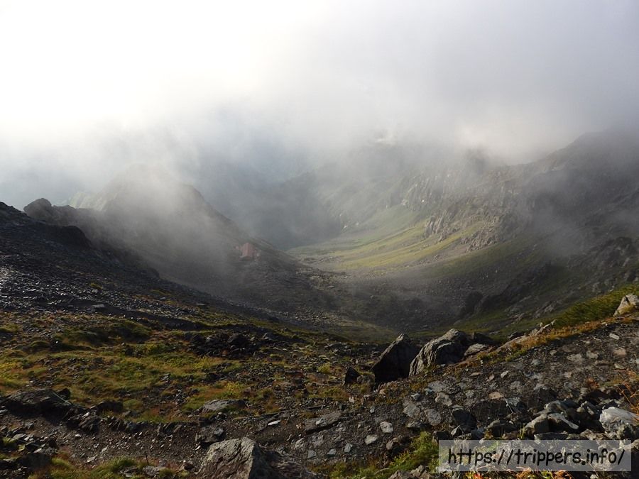 朝4時半頃起床し、外の様子を見るとガスっており朝日は見れなそうです。そして穂先の姿も見れません。唯一の救いは雨が降っていなさそうという事でしょうか。