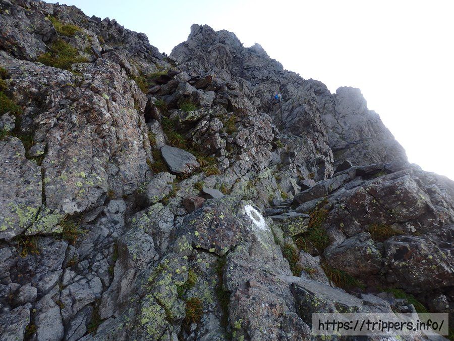 ゴロゴロした岩場をぴょんぴょん進んでいきます。登りで使いたくないルートです。段差が大きくて次の足場が分からない妻をリードする夫とすれ違いました。
