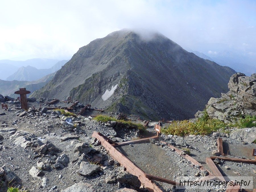残念な事にクラブツーリズムの団体は6時に下山開始のようで、昨日の大雨で穂先に登ってないだろうし、手を伸ばせば届く絶景を拝めないまま団体ツアーが故の団体行動でガスがどんどん取れていく穂先に登らず下山していってました。
