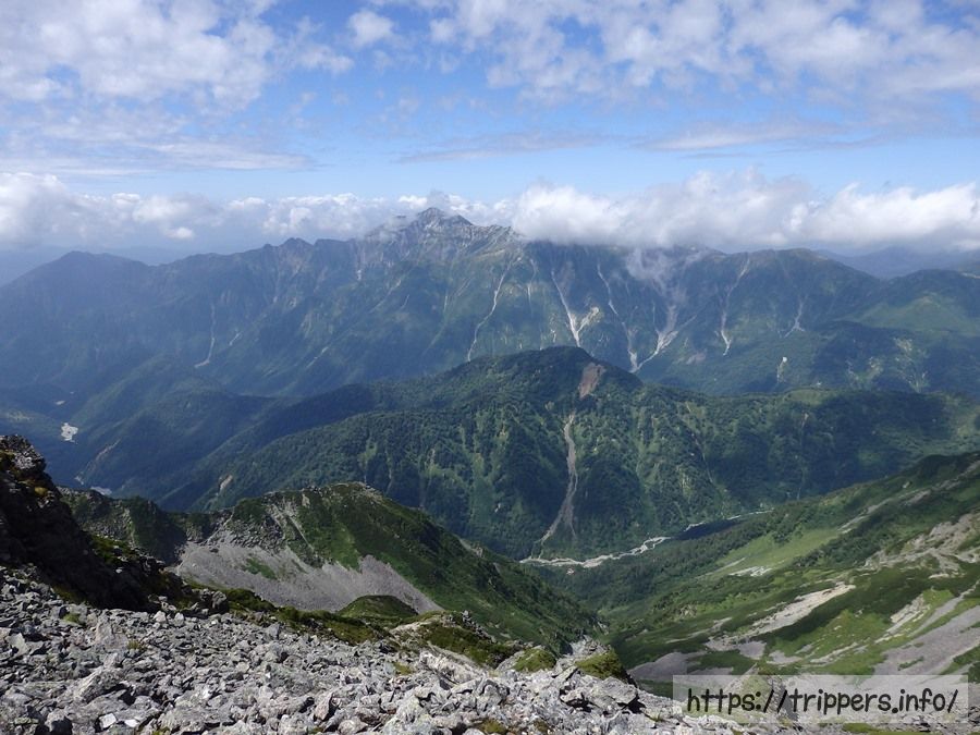 手前に双六岳、奥に黒部五郎岳。双六岳の山頂から槍ヶ岳へ続くように見える稜線の道筋が良く分かります。