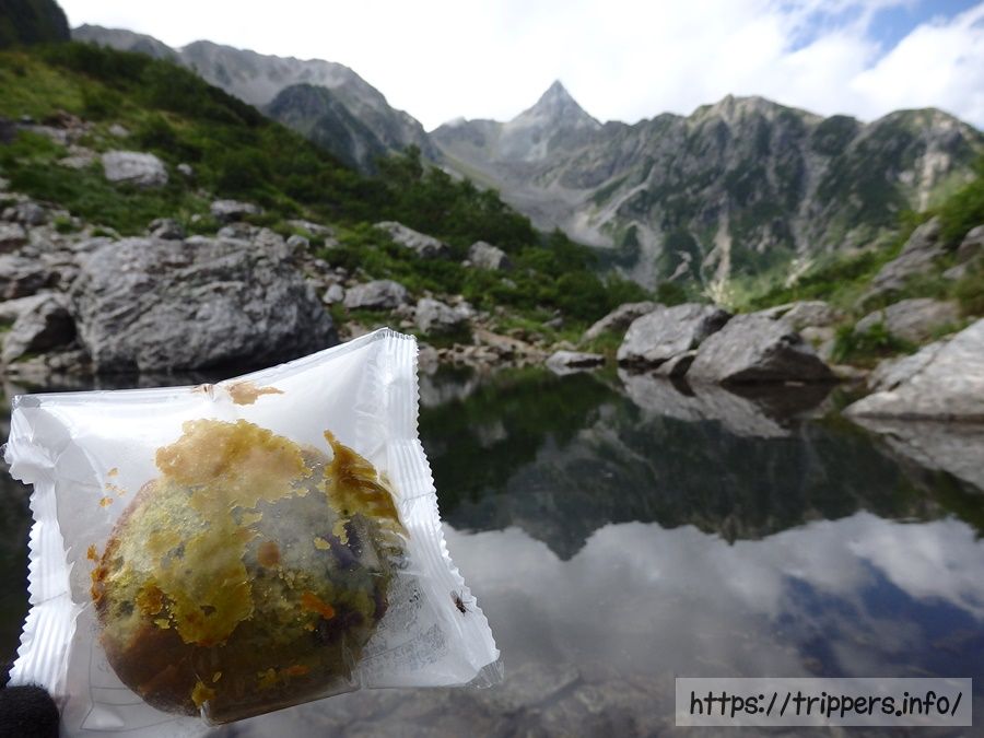 こちらの写真は槍ヶ岳山荘で購入した抹茶チョコマフィンです。水面が揺れてしまっています。ここでお菓子休憩です。本当は山荘で焼きたてパンを購入したかったのですが、登山客が少ないためか販売しないとの事でした。