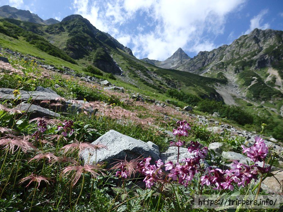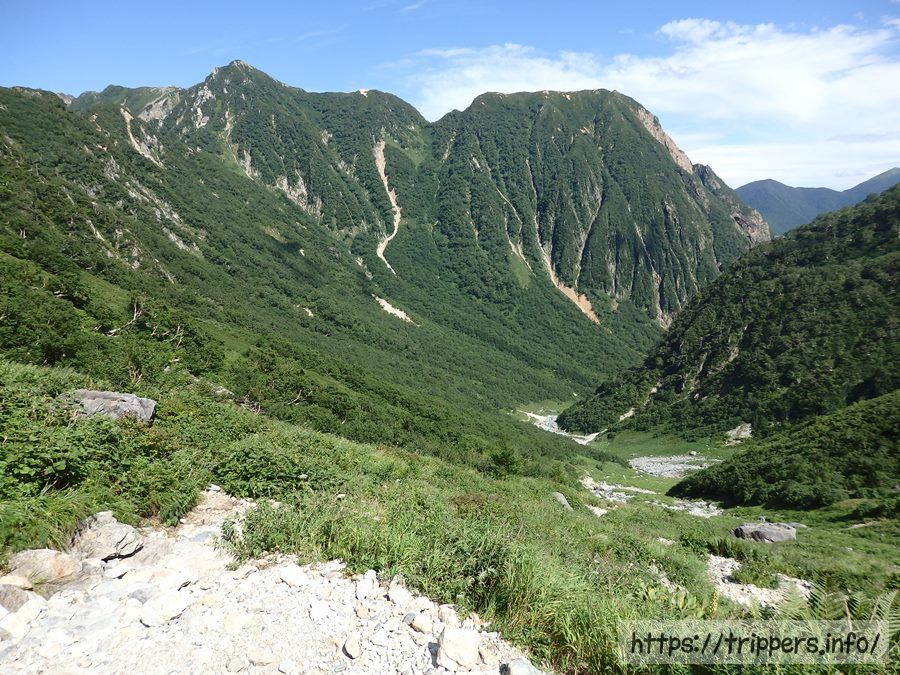 三俣蓮華岳と双六岳の巻道コースが見えてます。巻道コースはコバイケイソウの群落がとても美しい場所ですが、見た感じ一面緑なので花の見ごろは終わってる感じです。