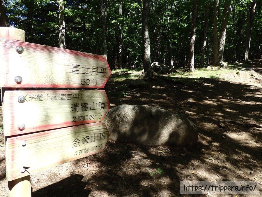 階段を上ると幅広の道に出てきました。そのまま幅広の道を進むのか、段差を上る道を登るのか、どっちでしょう?地図を取り出すと、どうやら幅広の道は芝生広場へ行き、富士見平小屋へは行くには段差を上る道を選ぶようです。