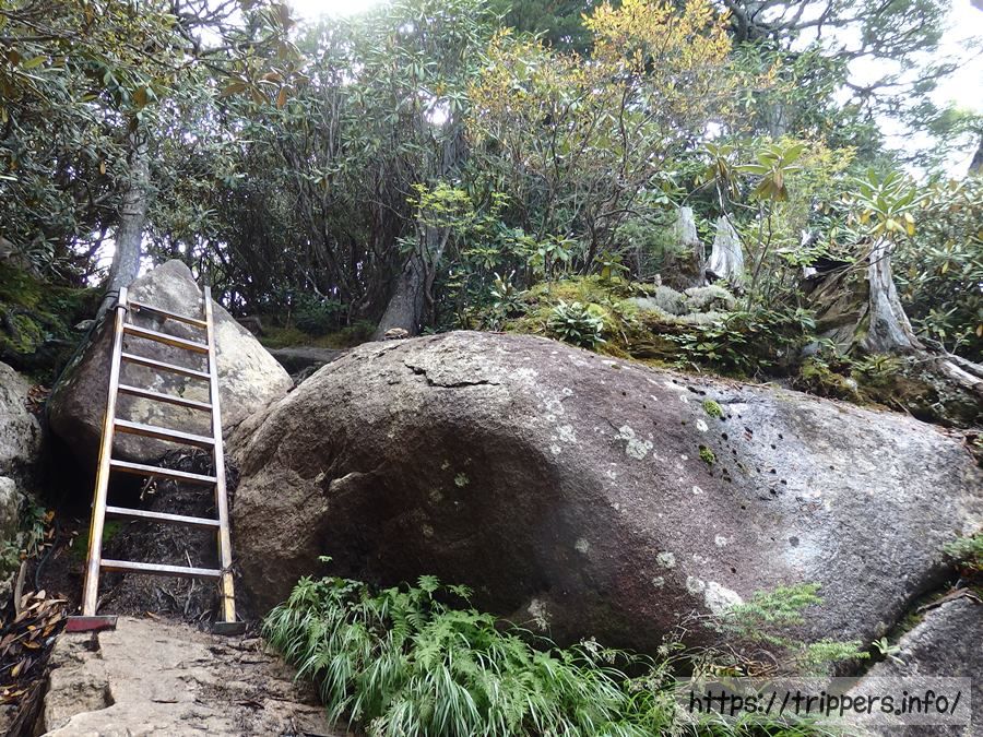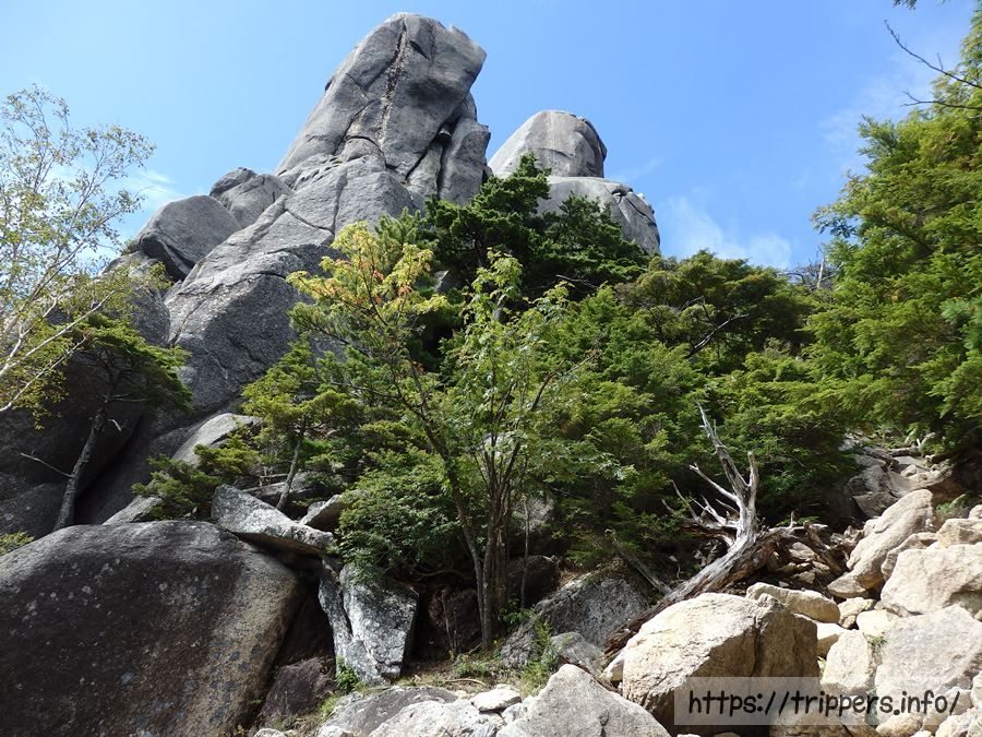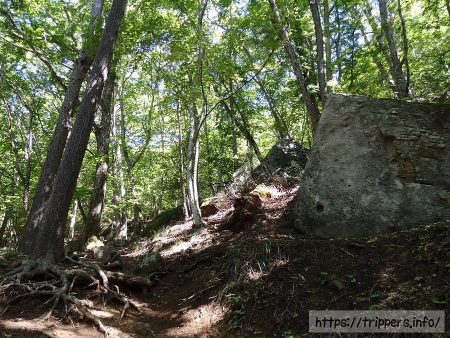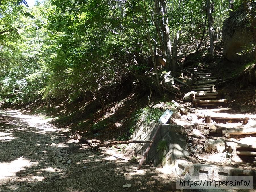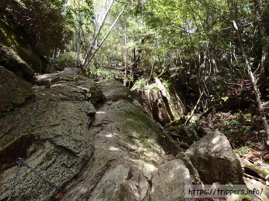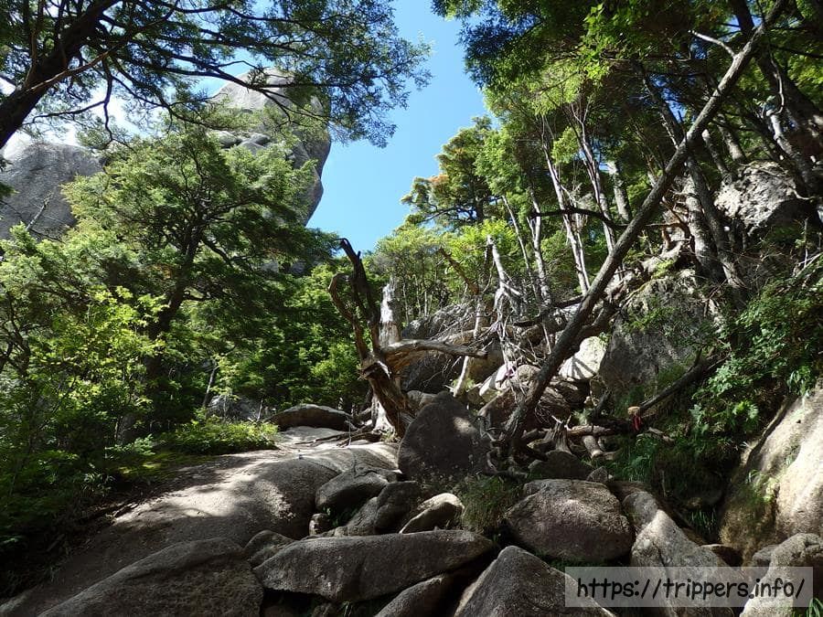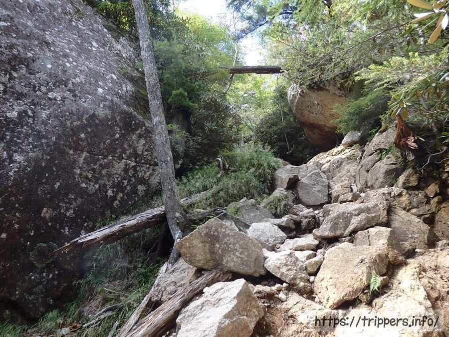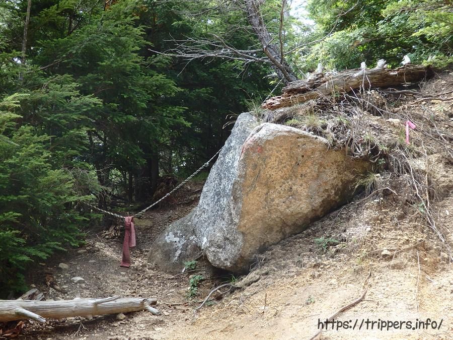 傾斜が急でかつ岩が1つ1つが大きく足を持ち上げるのが大変な場所を進むとT字分岐に到着しました。目の前には大ヤスリ岩がそびえ立っています。ロッククライマーはここを登るのだから、高所恐怖症の私にはこの岩の上が山頂でなくてほっとします。