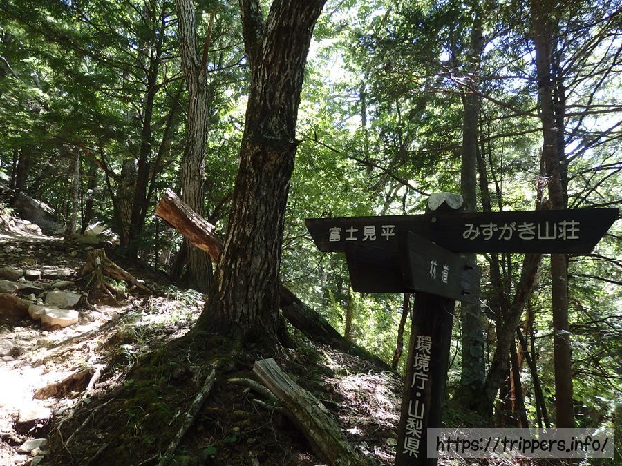 道は幾つもの小さな分岐が無数にあり、どの道も踏み跡がありました。どの分岐を進んでも同じ道に合流するのだと思いますが、初めて登る山で、登山客がいないため少し不安になりました。富士見平小屋へ到着するまでにすれ違った下山者は数組で登山者はゼロでした。
