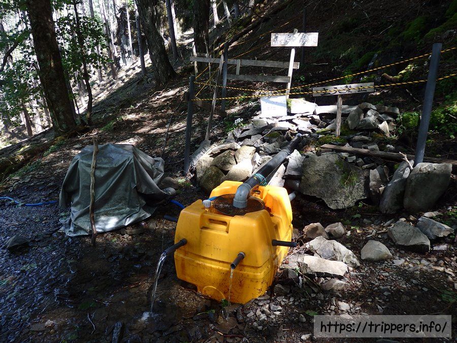水場に到着しました。地図には富士見平小屋に水場が記されていますが、小屋は見当たりません。ここは地図に記載されていない別の水場なのかもしれません。バス停から小屋まで50分の距離なので、もしここが別の水場ならここで水を組む必要はありません。