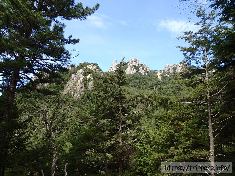 登山道からは瑞牆山の姿が眺められる場所がありました。この岩と緑のコントラストが瑞牆山の魅力ですね。