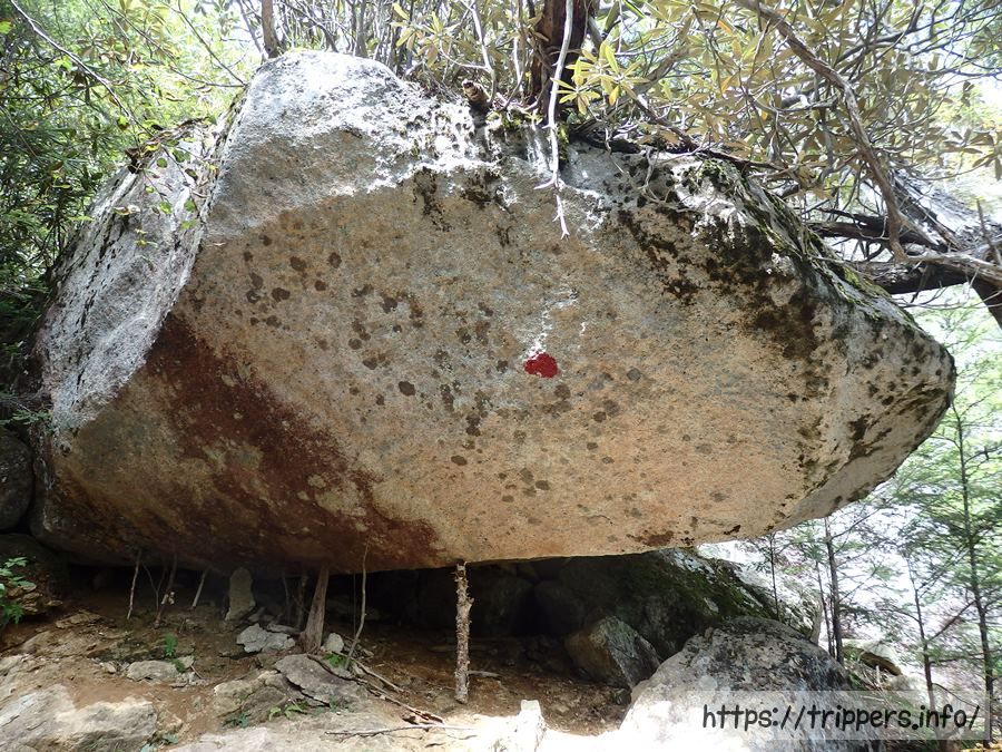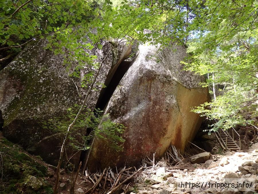 沢を渡れば桃太郎岩に出会えます。一見バランス悪そうに立っているように見える岩を支えているフリをしている枝は定番ですね。どういう人が枝を追加するのでしょうか?