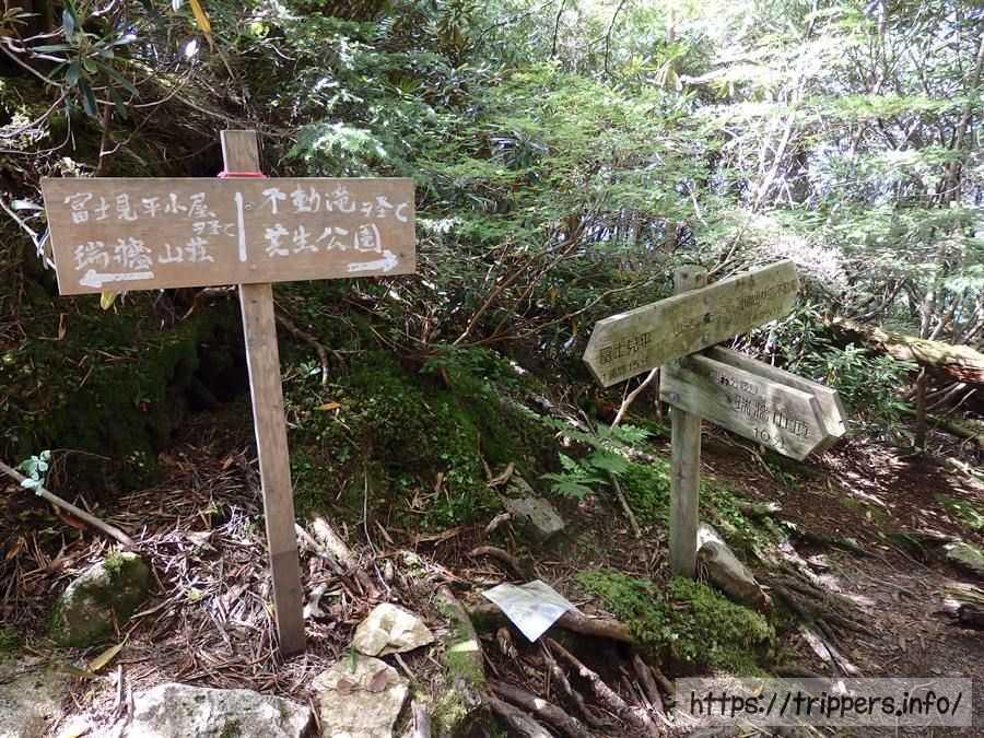 急な岩場を登りに登り、やっと着いたのは不動滝コースとの合流地点です。あと10分で山頂です。