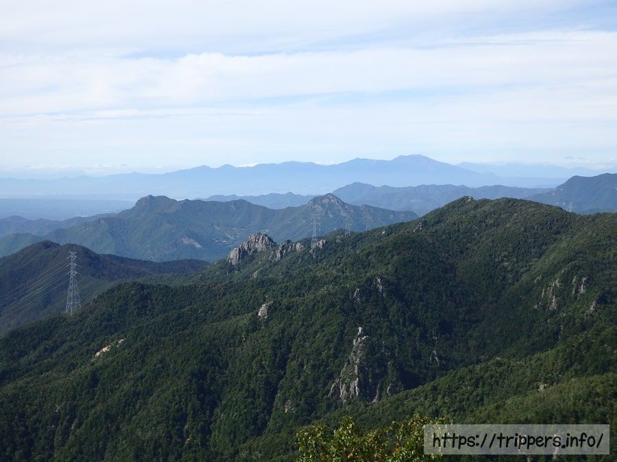 目の前には約270度近い角度の絶景が待ってました。右奥に見える僅かな突起のある山が明日向かう金峰山です。