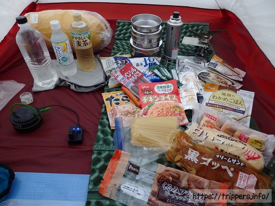 夕飯には早い時間にテント場に到着しました。今回持って来た荷物の一部です。食料を見ると質素かつバラエティーに欠けますが、55Lのリュックではこれ以上入りませんでした。餓死しない程度の4日分の食料はあります。