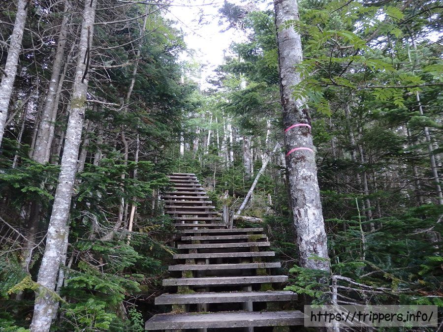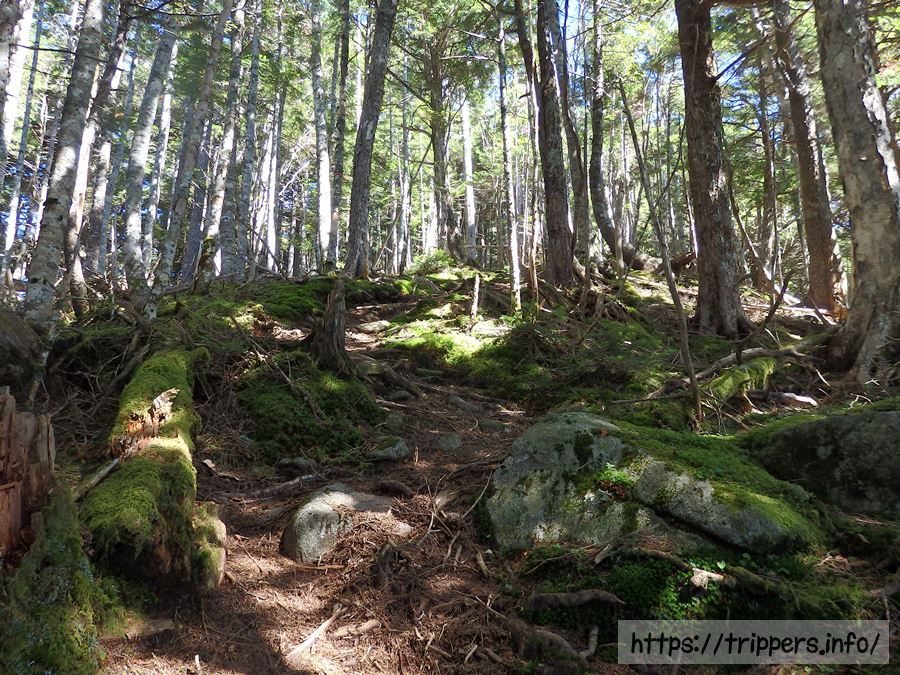 苔のガードレールで登山道が誘導されていると分かりやすくて良いですね。苔が生き生きしてとても綺麗です。