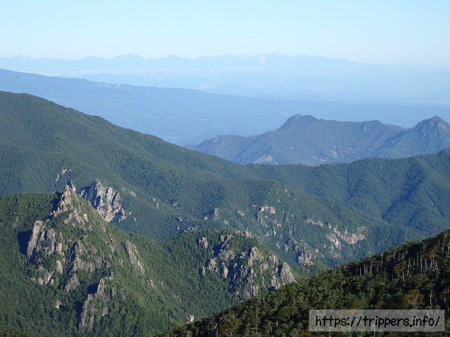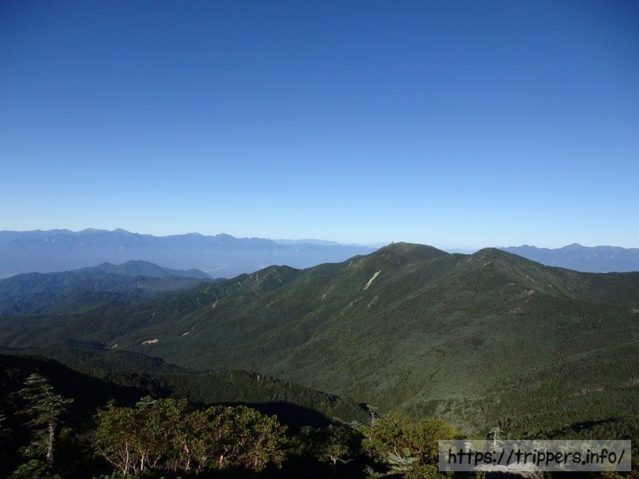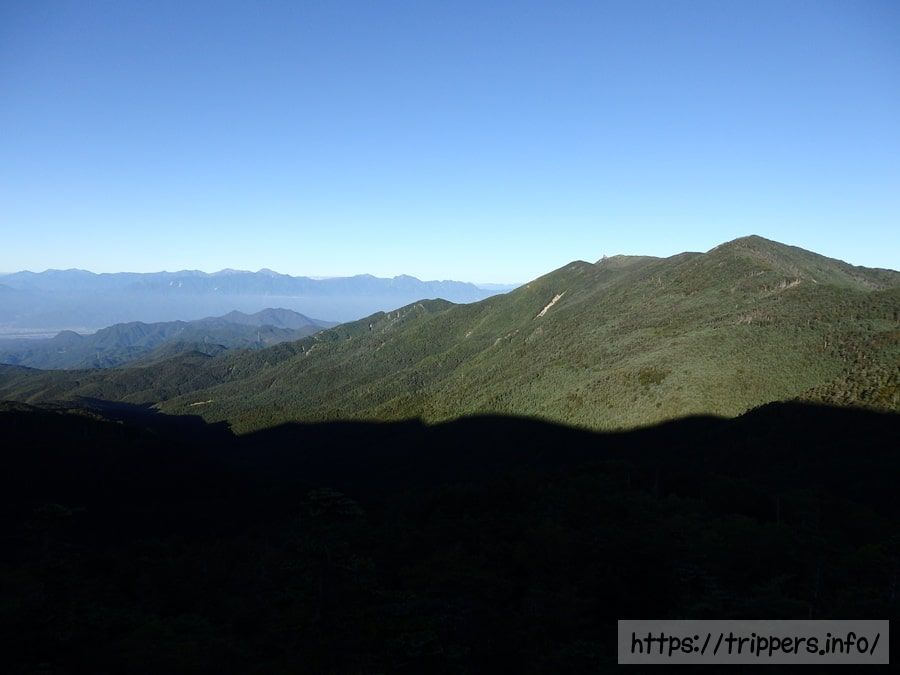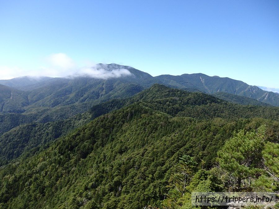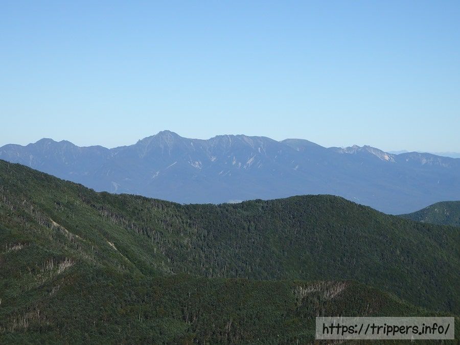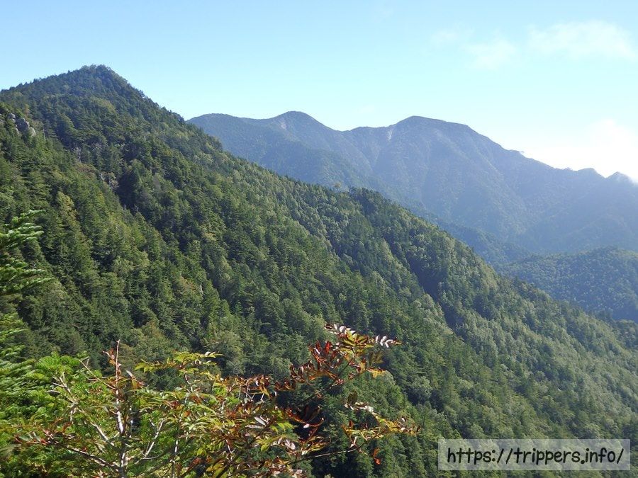 木々の隙間から甲武信ヶ岳とその右に木賊山が見えました。登った後だから分かりますが、この時はどれがどの山だかさっぱり。