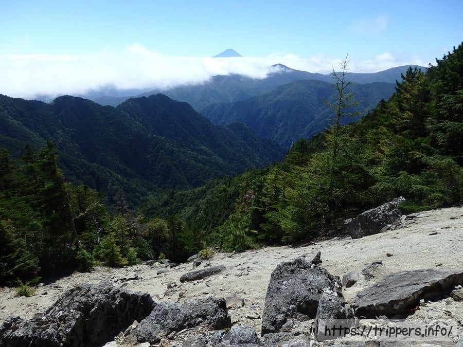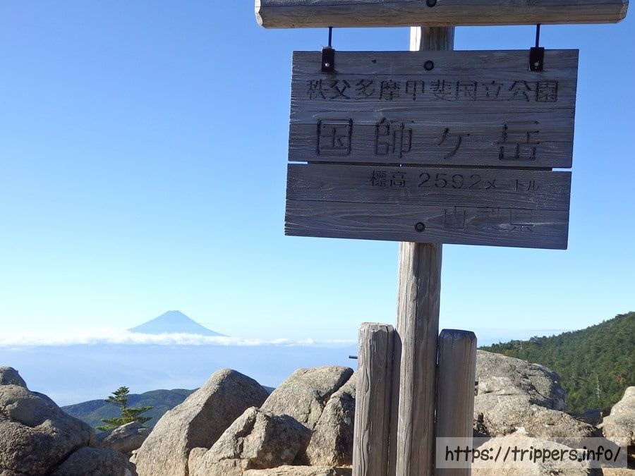 さっき通った分岐点まで戻り、国師ヶ岳へ向かいました。標高2,592mの国師ヶ岳からは富士山がド迫力で立っているのが見えます。