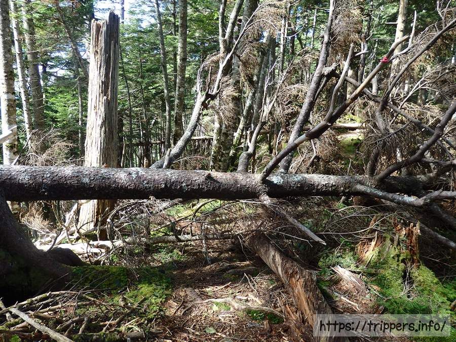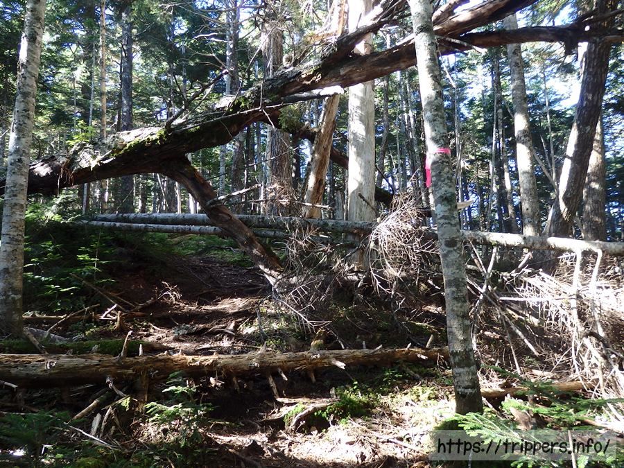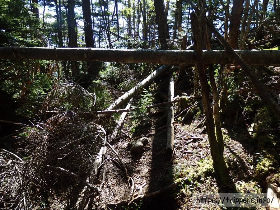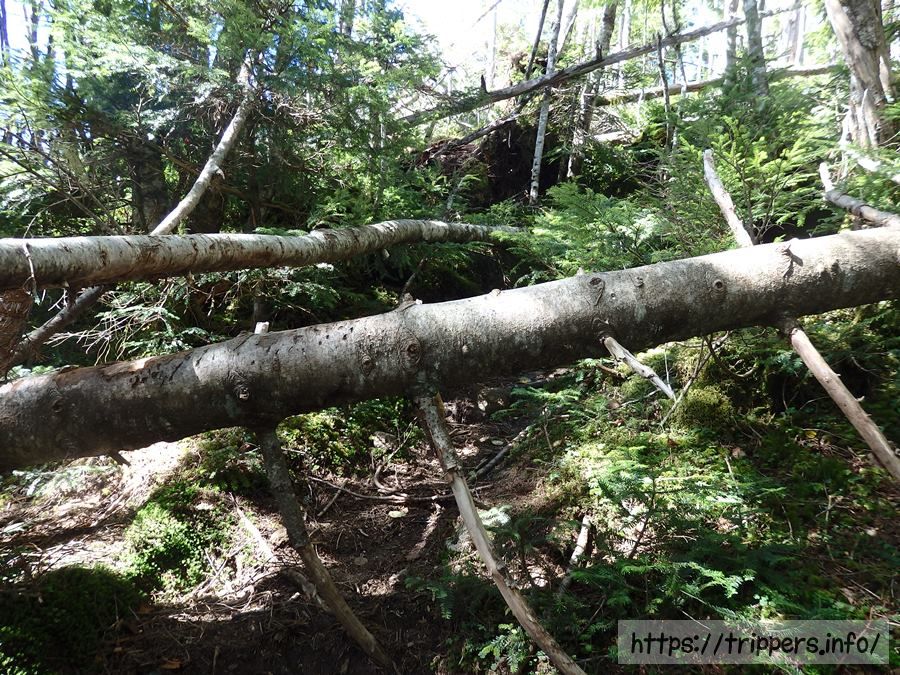 倒木で登山道が隠れて、道が分からなくなっています。登山道から3回ほど外れてしまう結果になりましたが、道がないためすぐに気が付き、引き返してルートを探します。