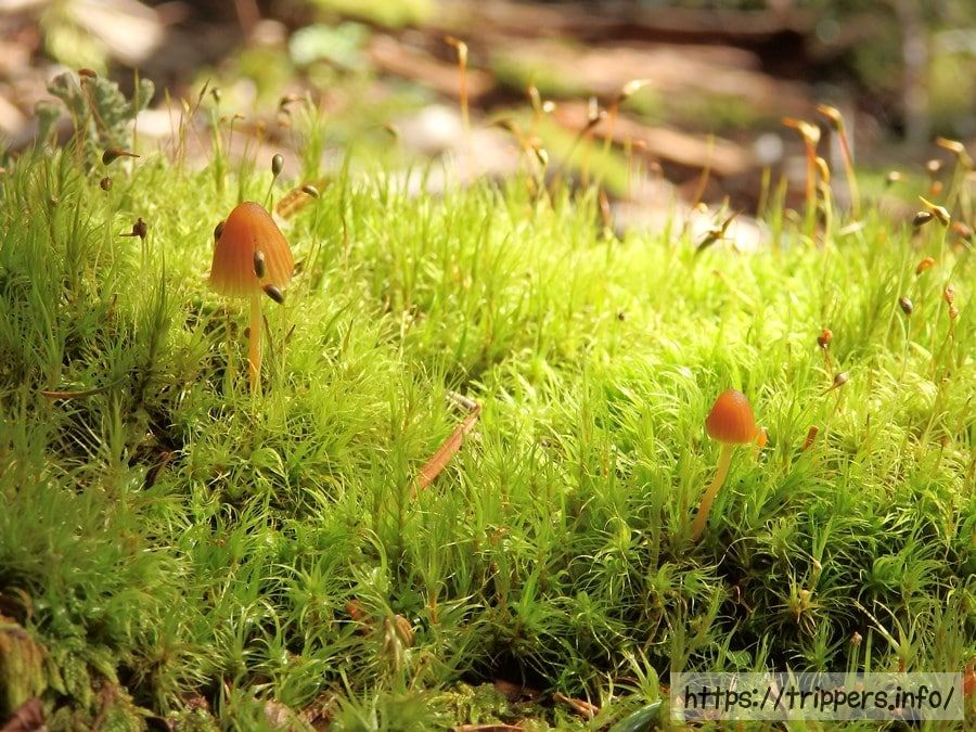 苔とキノコの組み合わせは最強です。昨日湿度が高かったために苔は綺麗な色をしており、そこに陽が当たって輝いています。