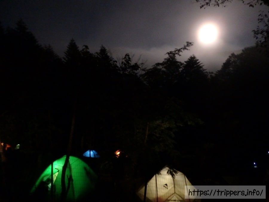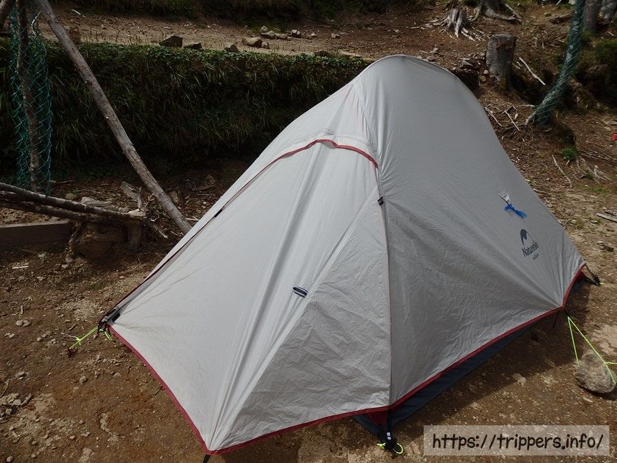 テントの数は少なく、良い場所に張れました。平坦で、地面に石ころが少なく、隣にテーブルがあります。