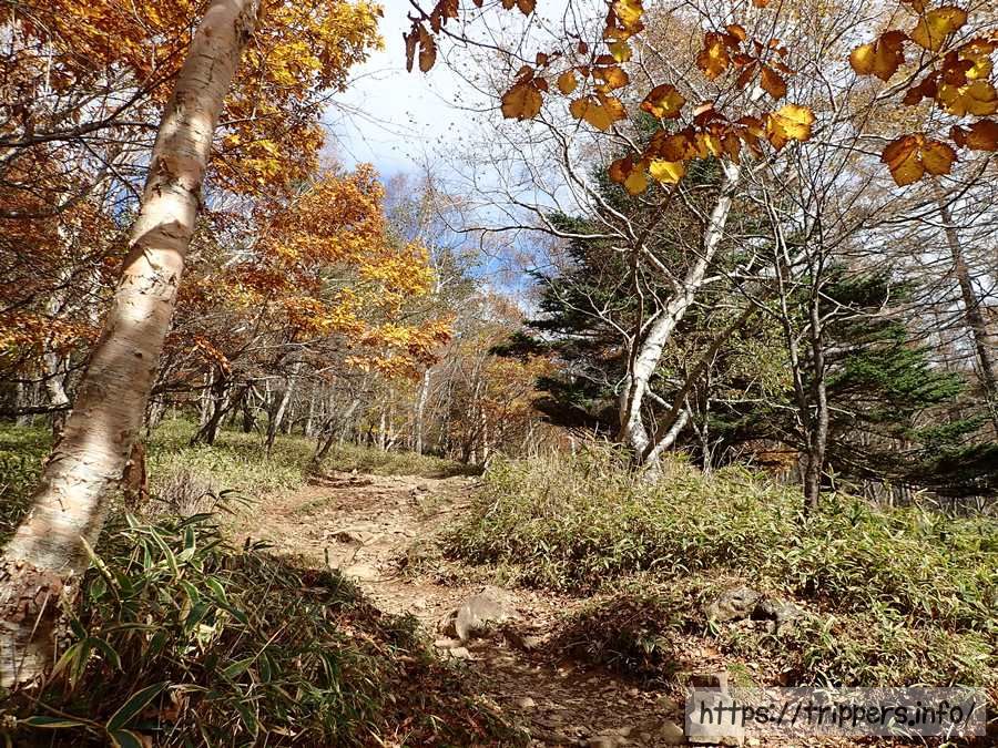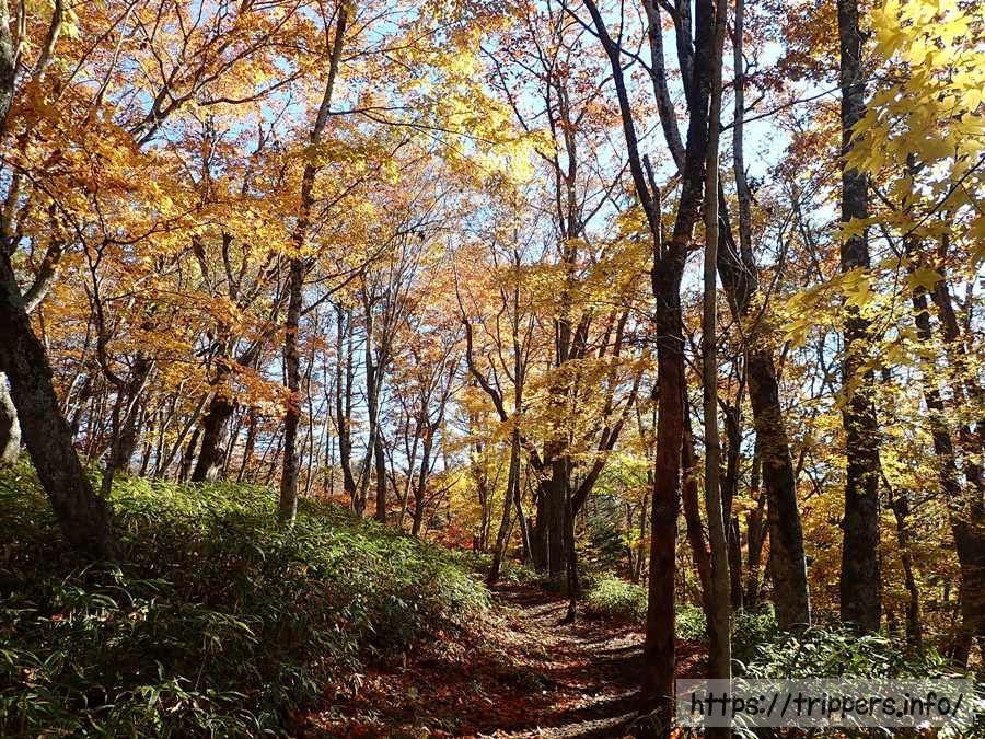 紅葉が綺麗に色づいてます。簡単な登山であっても登山届を提出して登山を開始します。