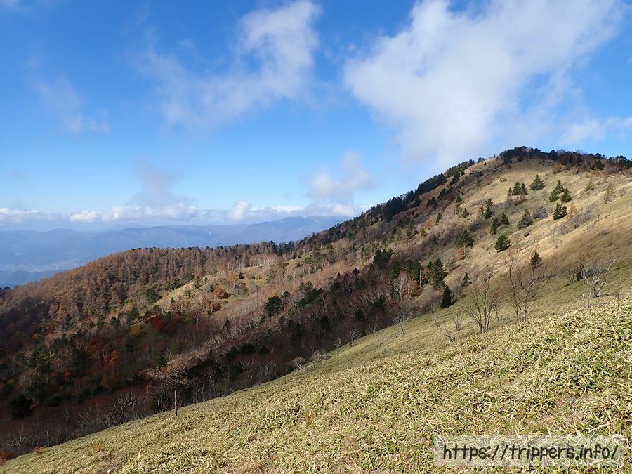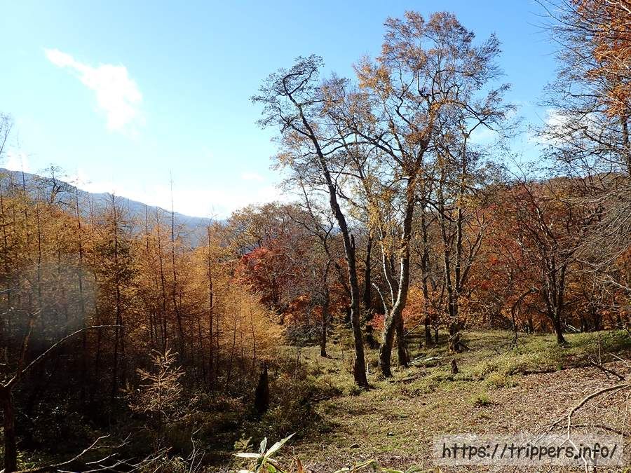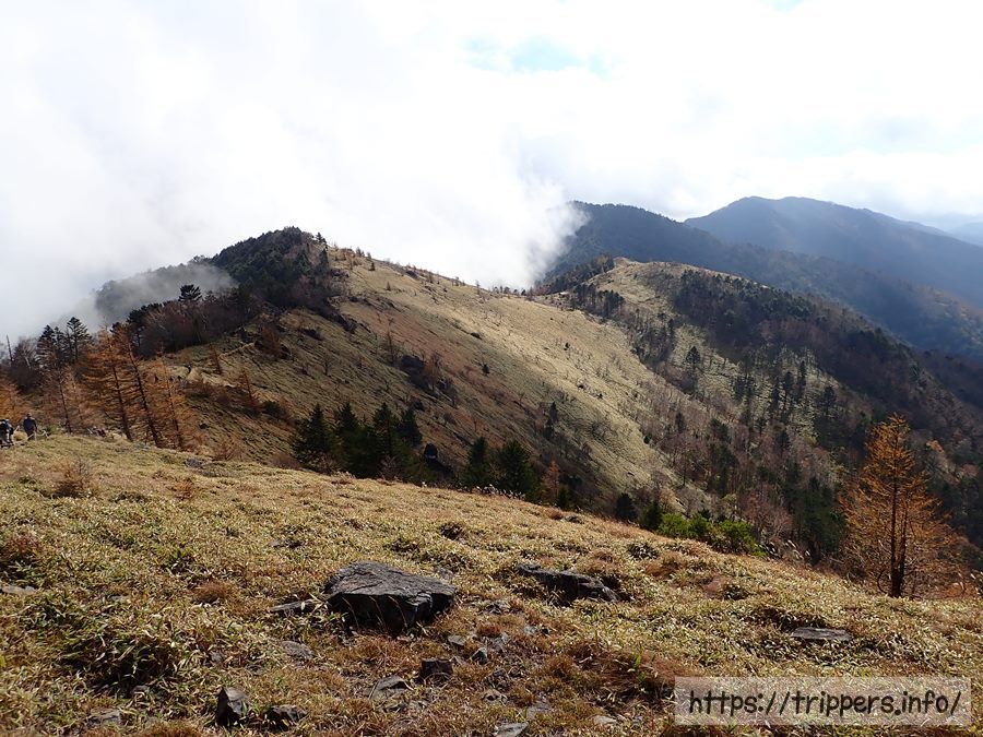 目の前には下山で利用する唐松尾根が見えてきました。今回の登山で一番の勾配があるので、登りで使うより下り使用が楽だと思います。唐松尾根の頂上から大菩薩嶺の山頂はすぐなので、山頂までは遠くなさそうですね。