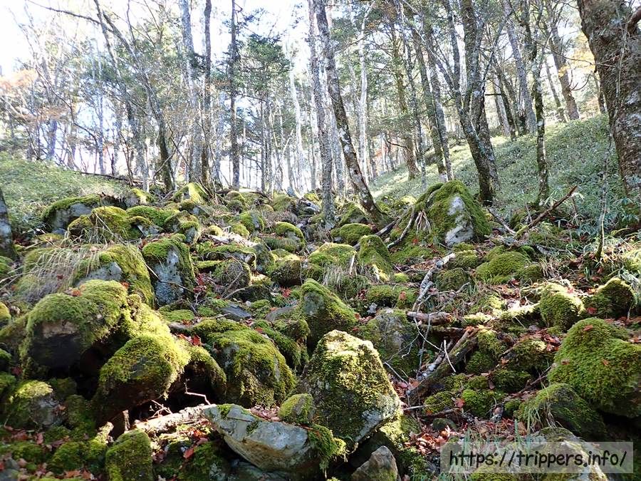 大菩薩峠に近づいてくると苔むした岩が見えてきます。単調になりかけた景色に変化を与えてくれました。苔好きにはたまらない場所です。岩場ではないので岩の上を歩く必要はありません。苔むした岩の上は滑りやすいです。