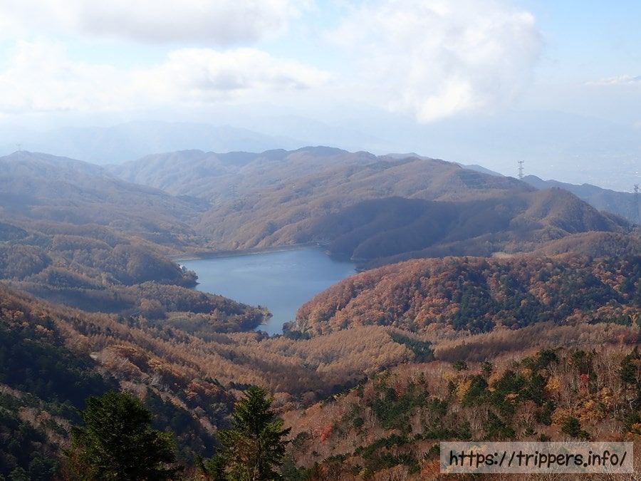 眼下には紅葉した木々に囲まれた大菩薩湖が見えました。本当は奥に富士山が見えるのですが、残念ながら雲に隠れていました。