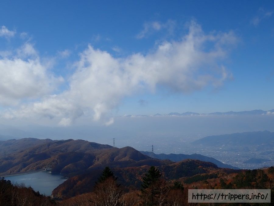 大菩薩湖の右側には甲州市の街と南アルプスも見えています。