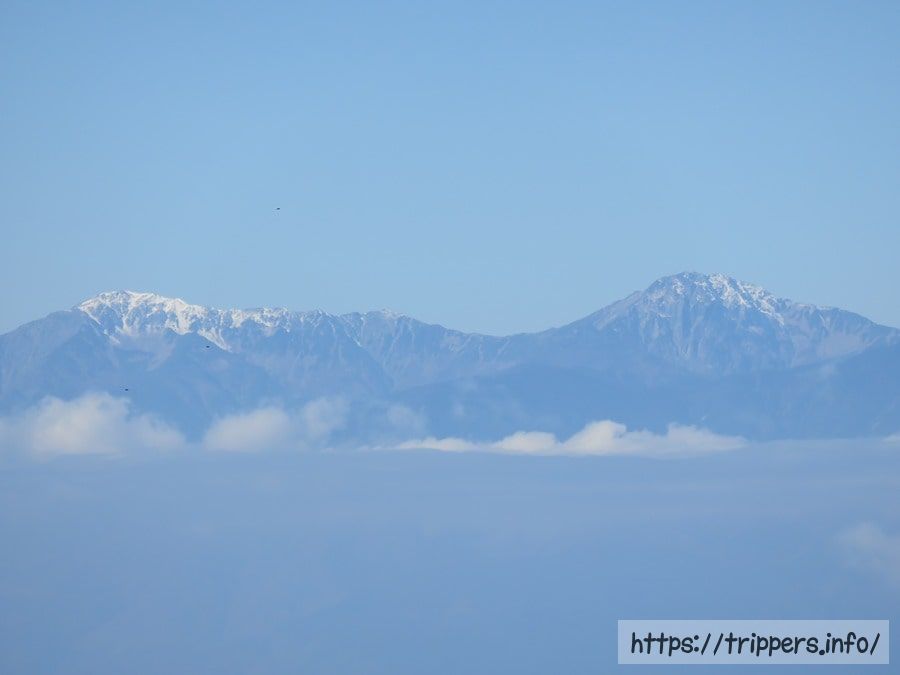 山の上に山が浮かんでいる光景は合成した写真のようで不思議です。南アルプスがそれだけ標高が高く、標高が高い場所で空気が澄んでいる事を意味しているのかもしれません。