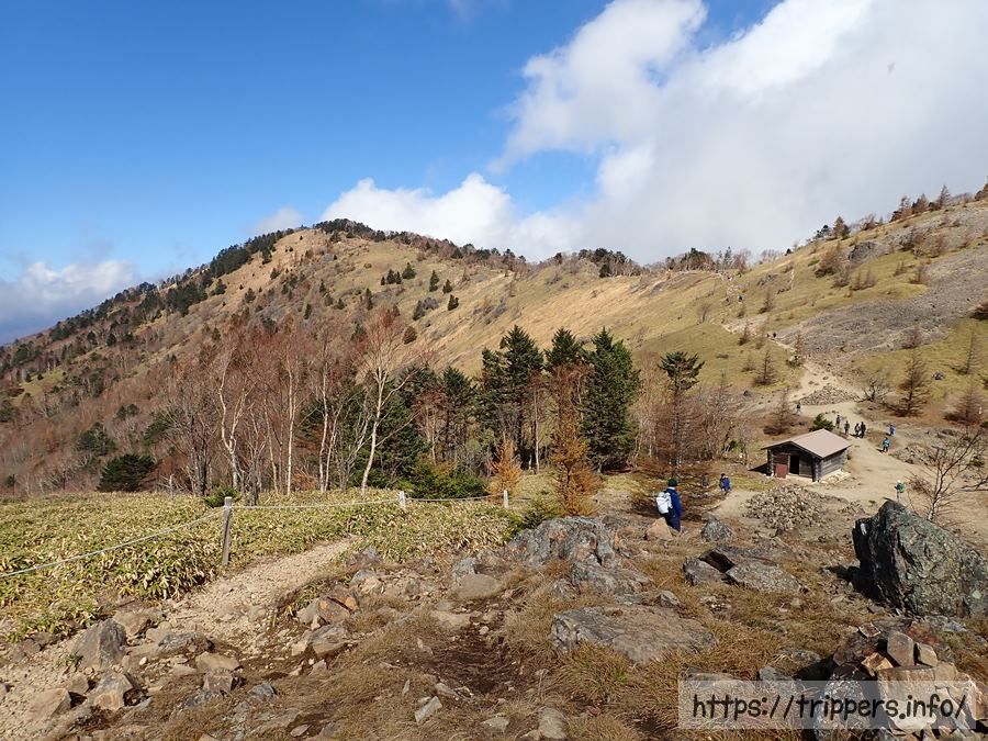 賽ノ河原に到着しました。小屋が見えますが、避難小屋で前もって予定した宿泊には対応していないと思います。なだらかな稜線歩きは気持ちが良いですね。