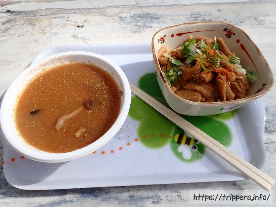 持参したおにぎりと、注文したキノコ汁やもつ煮込みで昼食タイムです。もつ煮込みがめちゃくちゃ美味しかったです。予想していたよりも、もつの量が多めです。