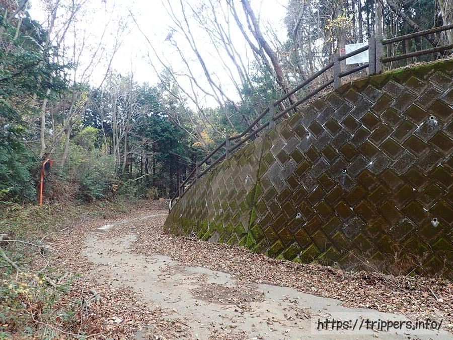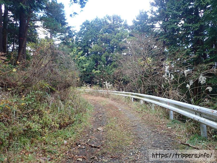 暫く歩くとガードレールがある車道に出ます。車で来れるか分からない道ですが、車道の先に登山道が続いているので、そのまま進みます。