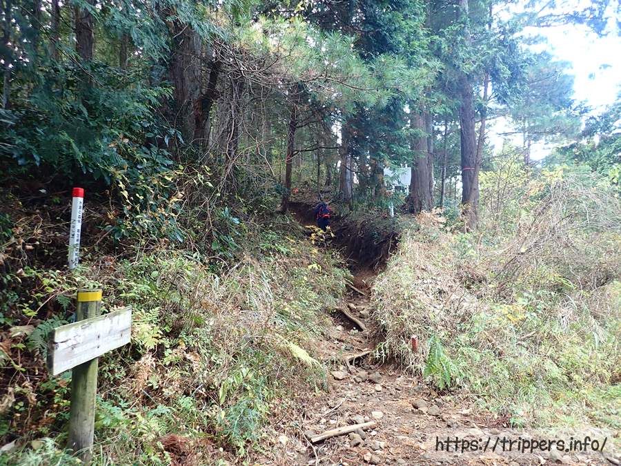 車道の先に続く登山道の入口です。ようやく登山者を1人見つけました。明神ヶ岳の山頂に到着するまでに出会った登山者は10人程でした。